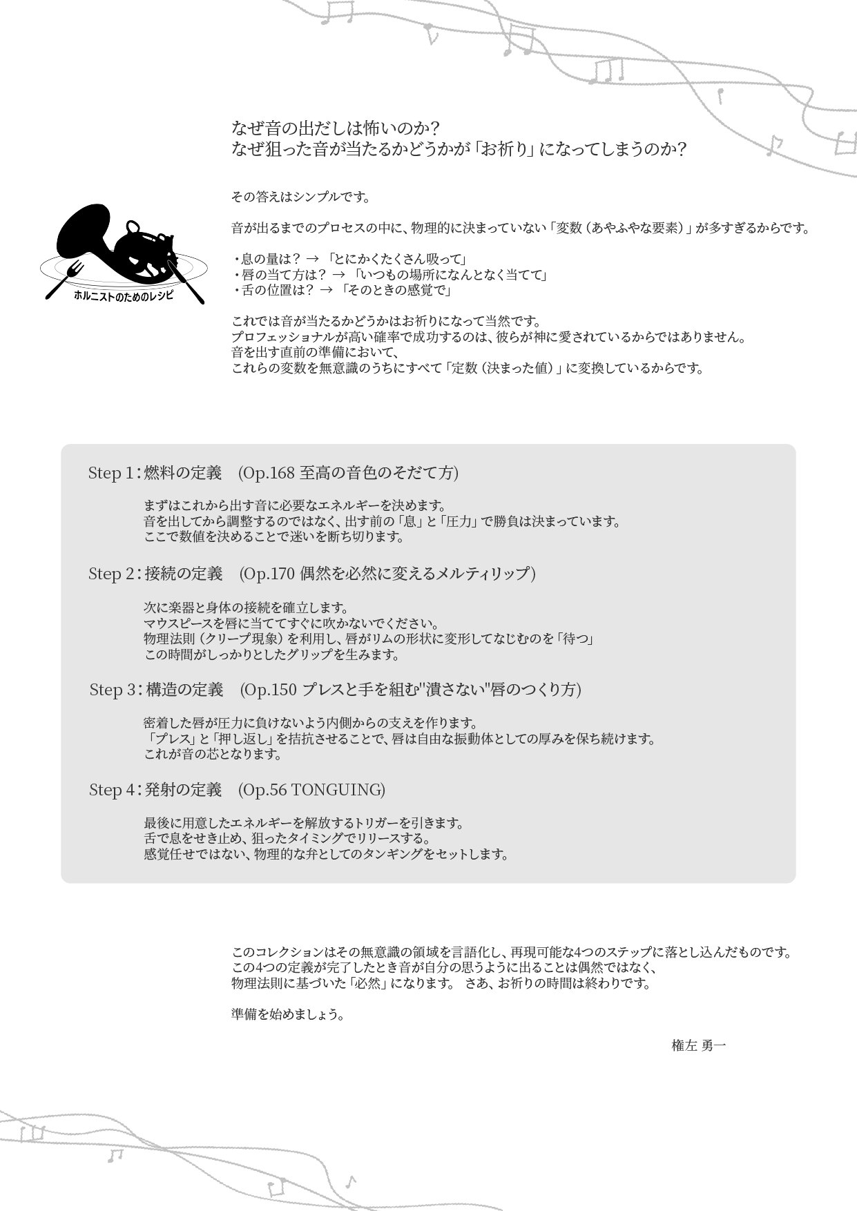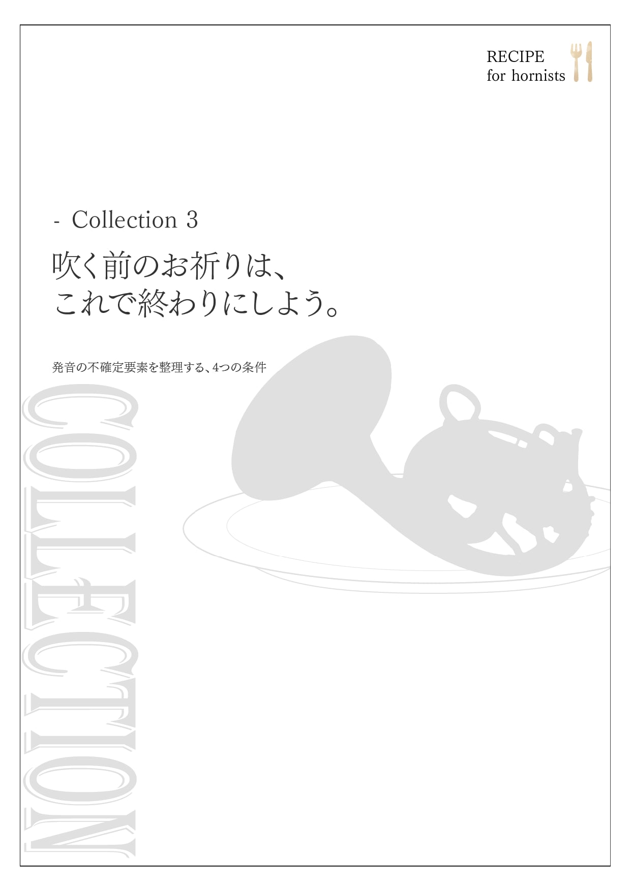 3作目のコレクション『吹く前のお祈りは、これで終わりにしよう』は、 息を吸ってから音が出るまでのブラックボックスを解体し、 すべての工程を物理的に「定義」することで、あなたの演奏から「運」の要素を極限までなくすために生まれました。