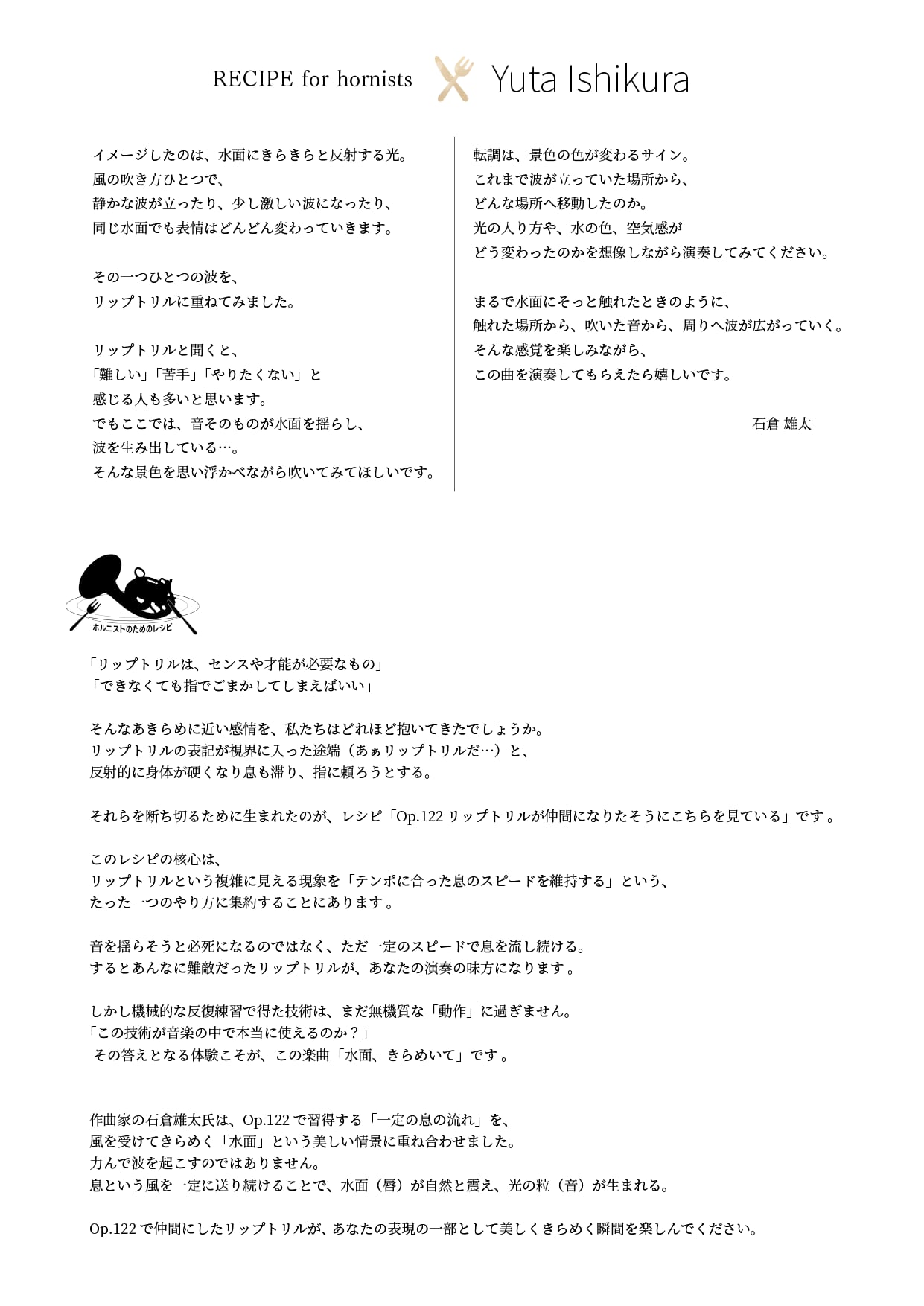 しかし理屈では分かっていても、いざ楽曲の中でトリルの記号を見ると、条件反射で力んでしまったり、息が乱れて失速してしまうもの 。 この「実践での壁」を越えるため、作曲家・石倉雄太氏とのコラボレーションにより、Op.122のメソッドが音楽的な必然性を持って機能する楽曲が生まれました。